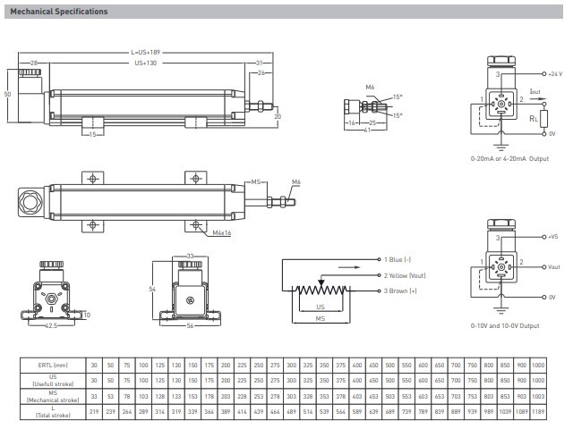 Linear potentiometers are displacement transducers that convert the linear motion of a rod or shaft into an electrical signal that represents its position. These linear position sensors (also called linear potentiometric transducers or linear position rulers) allow accurate measurement of an object’s position within the specified stroke range of each model.